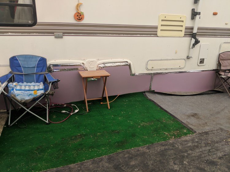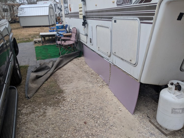 After church, I returned home and changed into work clothes. I started putting insulation board around the base of the RV. I don’t know if we will have anymore multiple days of below freezing weather this season, however, my plan is to save the insulation when we store the RV for the summer. That way I can reuse it next winter.