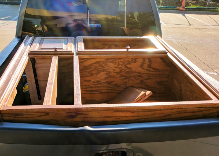 First thing I did this morning was to load the entertainment center into the pickup. It looks like too big of a job for an old man to handle alone. But this old man knows how to use leverage (and brute force) so I made short work if it.