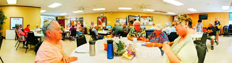 Good group at the senior center today. We had turkey and gravy with mashed potatoes, peas, dinner roll, and an orange.