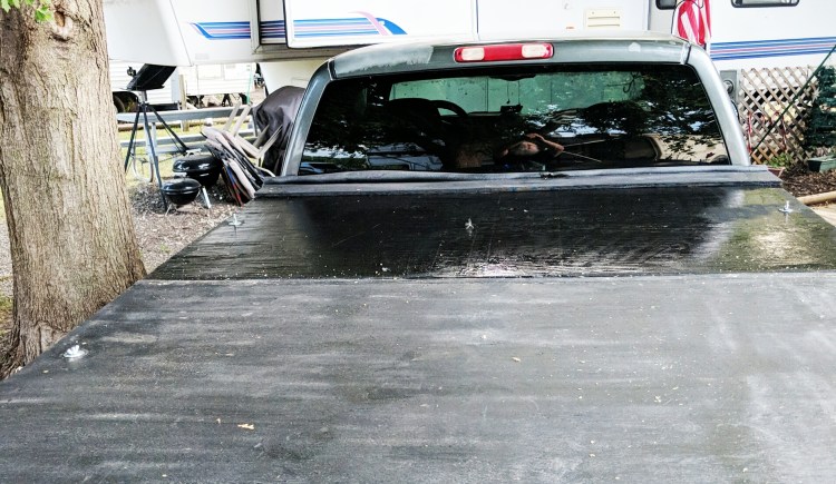 When we returned home, I started coating the truckbed cover with liquid rubber. I only got the front section finished.