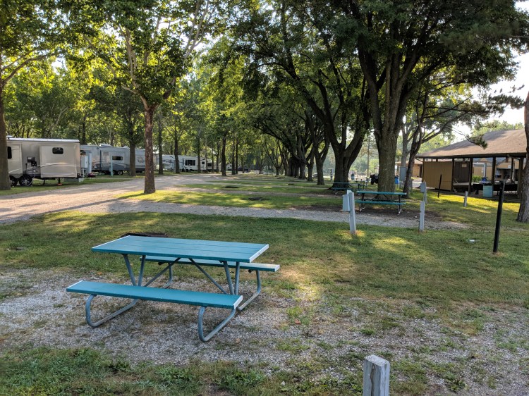 The resort is unusually quiet today. This front row of camping sites on Main Street is never empty. The local schools start this week which has families focused on other things. Labor Day is only a couple weeks away. So, many folks are waiting until then to camp.