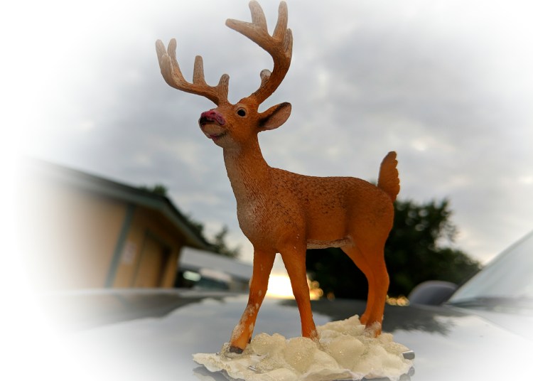 I’m aware that he’s not a caribou. However, Bomgaars only had white-tail deer rather than reindeer. He is glued to three super strong magnets with white Gorilla glue which has the added benefit of foaming to look like poles of snow.