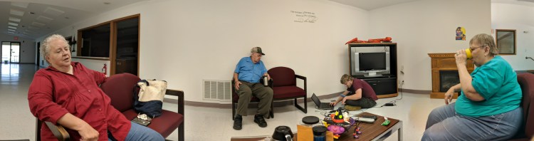 Sandy, Francis, Ella and I were the only ones who gathered for coffee at the club house today. The young man sitting on the floor is Trevor. He’s not part of our group but was there to use the WiFi as he was working on his two computers. Keith and Jean began their Southward attorney dragging their fifth wheel home behind them.