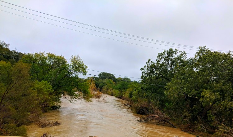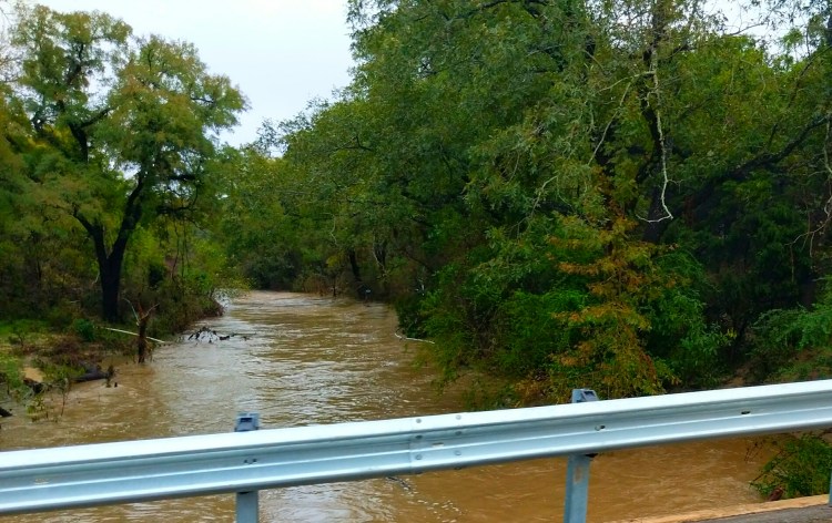 The South San Gabriel River bridge on 1869 (our main road from home into Liberty Hill) flooded over during the early morning hours today. By the time we went over it at around ten this morning, the water was once again running late under the bridge. However they was debris from the flooding still on the bridge. I didn’t think to take pictures this morning. I did take pictures on our return home this afternoon. This is the South San Gabriel River which most of the year can be walked across and maybe get your ankles wet