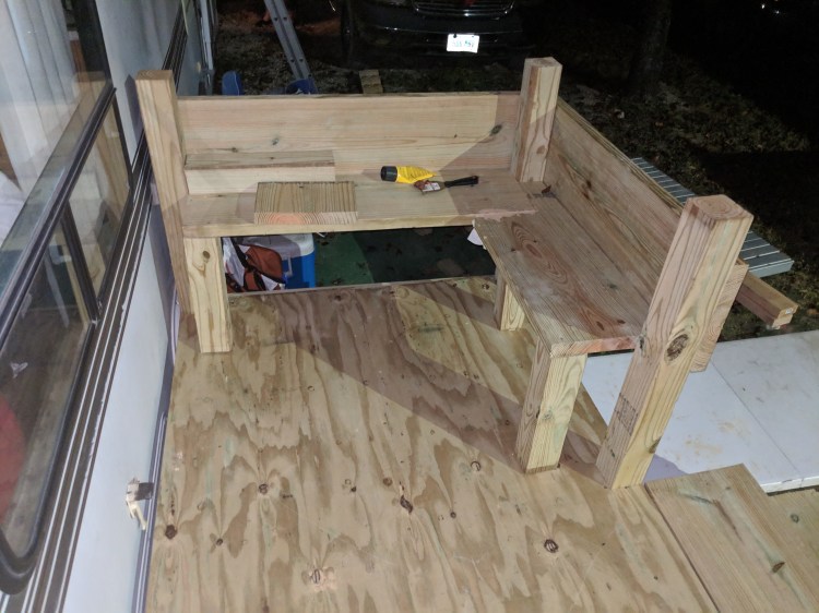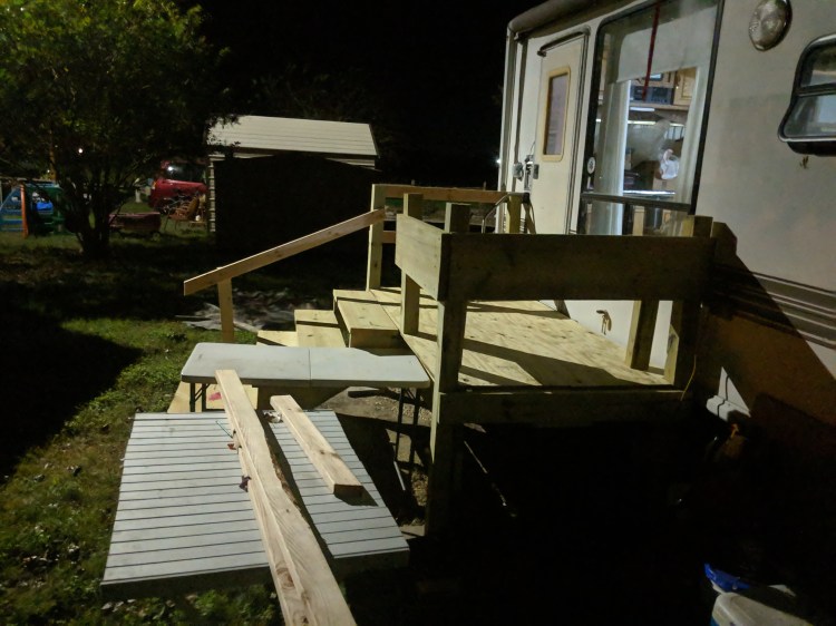 I’ve been so busy putting the deck together that I forgot to take pictures. It is done. I will paint it and carpet the deck sometimes in the next few weeks if the weather allows.