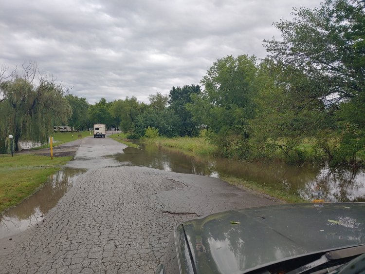 The water had gone over the road but is now receding. By thetime we were done with coffee, it had dropped several feet on the northwest side of the road.
