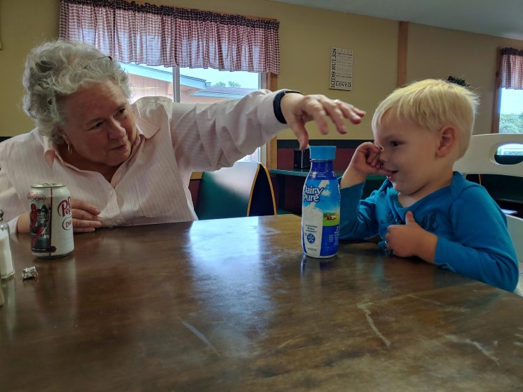 Great grandma and Henry discussing how to put the lid on his milk. We went to the cafe for pizza. Then home for a nap.