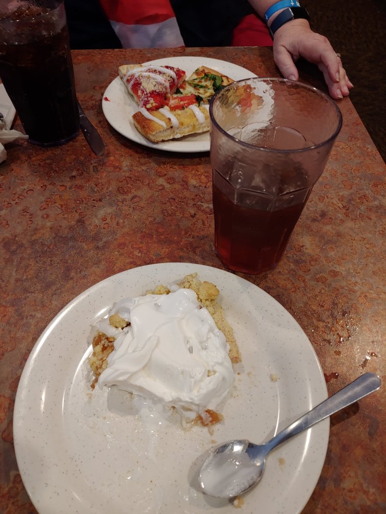 We went to Pizza Ranch for lunch. I had chicken, mashed potatoes with gravy, and dressing. Ella had several different pizza flavors including spinach. We both had dessert pizzas. I had apple with ice cream. She had cherry and apple (I think).