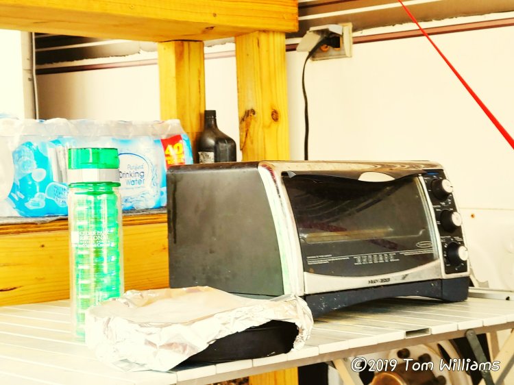 Not wanting to heat the inside of our home anymore than it already is (85°), I brought the convection oven outside under the awning.