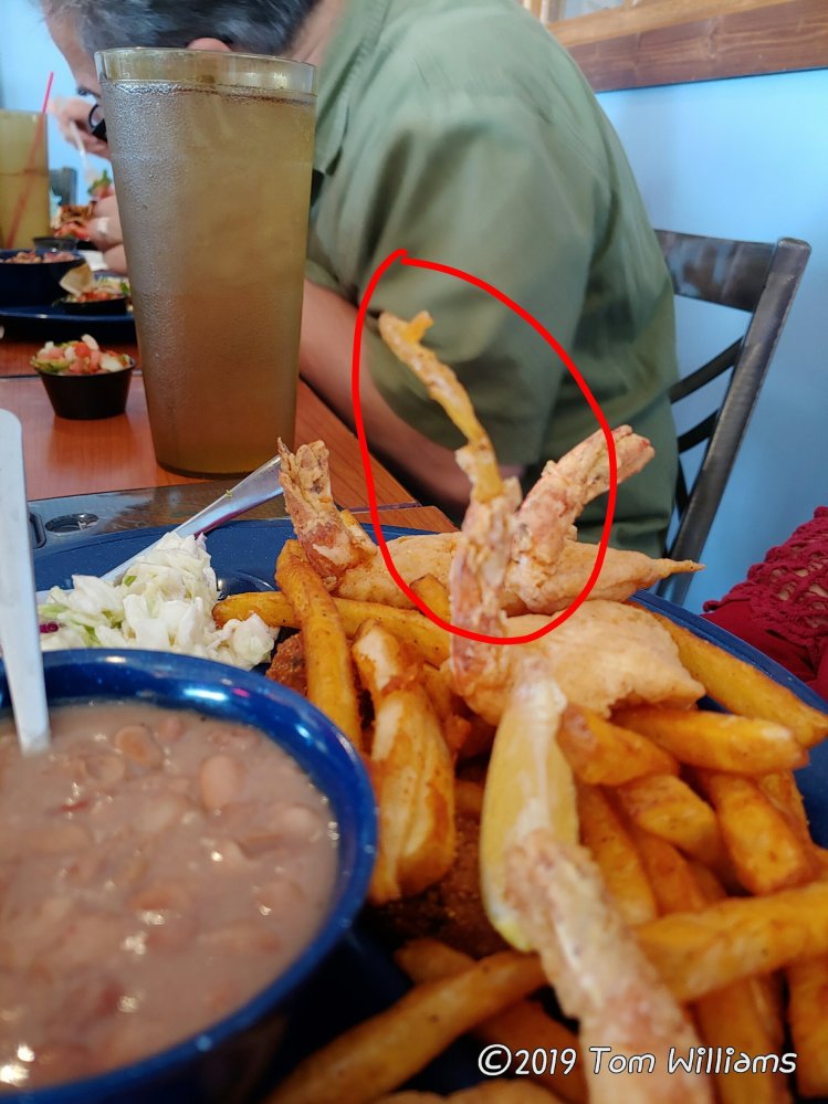 s a plate of potato chips we being passed around, a chip fell onto Ella’s plate and landed standing vertically in the tail of a shrimp.
