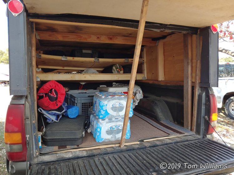 worked on the inside of the topper today. I put down a sort of subfloor with pieces of plywood that I had on hand. I should explain that the truck bed has two heavy steel rails the run crosswise near the center of the bed. They are there to mount a fifth wheel receiver hitch