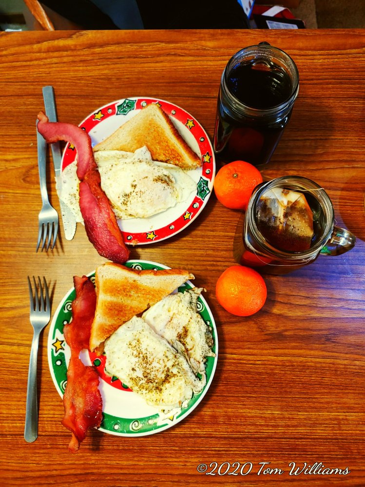 reakfast was two eggs, toast, bacon, tangerines, coffee or tea. Coffee for Ella and hot tea for me.