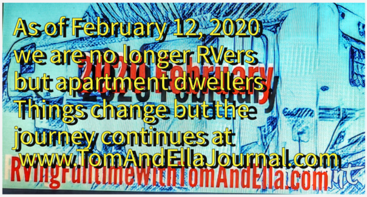 I am slowly easing my journaling to my other blog http://TomAndEllaJournal.com RVingFulltimeWithTomAndElla was originally set up to blog our RV journey. As both of our RVs are on, more or less, permanent sites now, it seems reasonable to change our focus to journaling this stage of our lives on http://TomAndEllaJournal.com.If you have been following this, the old site, I strongly encourage you to follow our continuing story on http://TomAndEllaJournal.com.