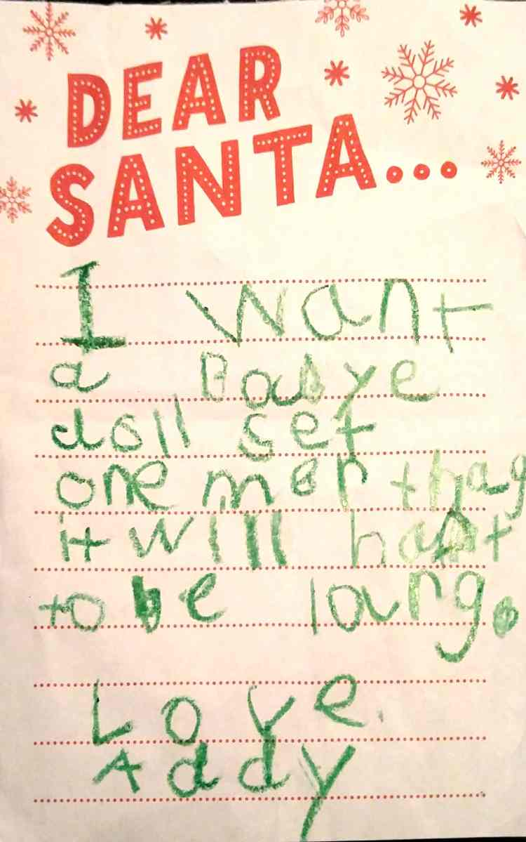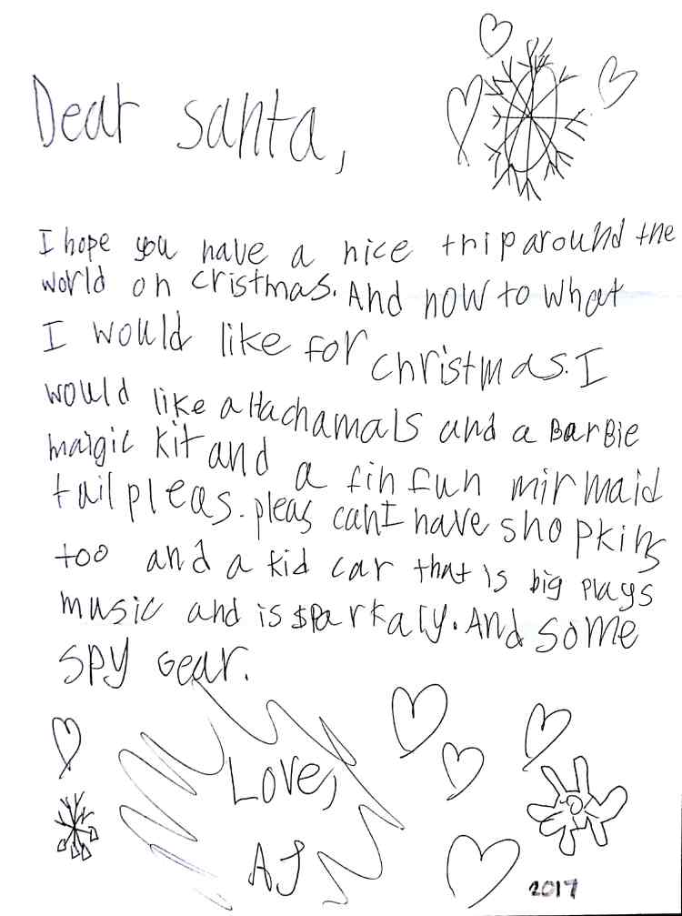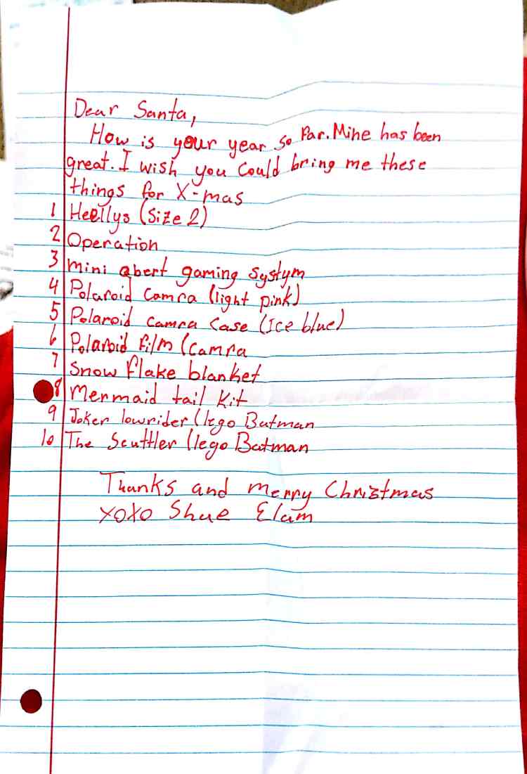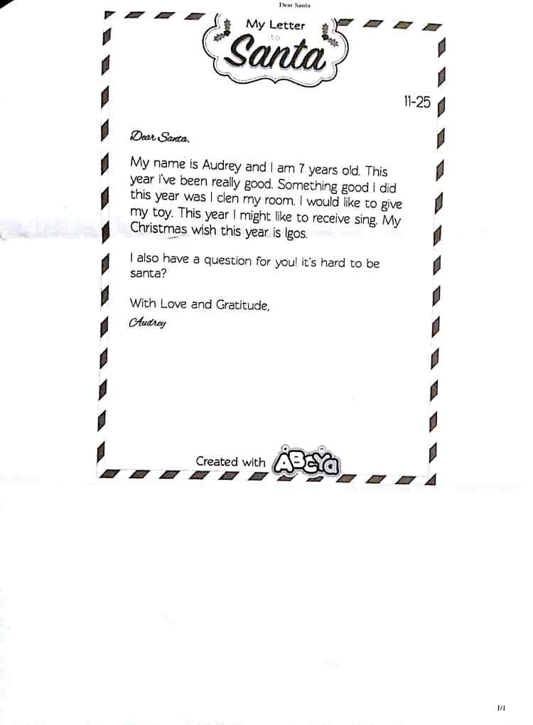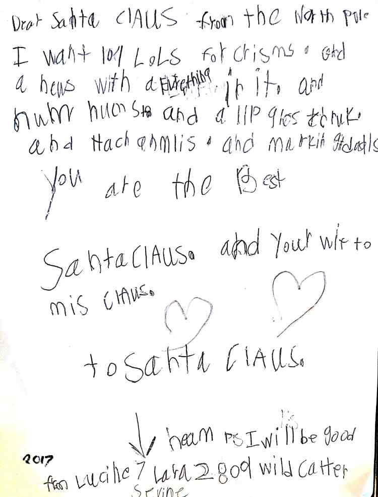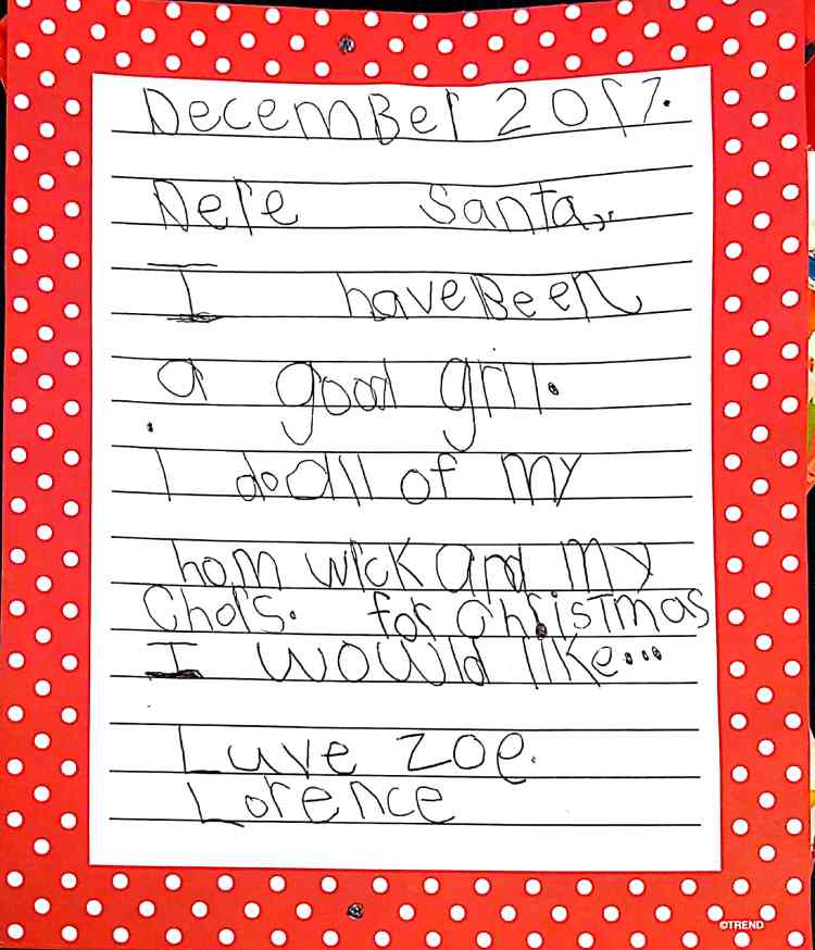 Monday 18th This was an unusual day for two reasons. One, I worked the afternoon/evening shift, 4-9. Santa Charlie had an engagement in the evening so we traded shifts. Two, Ella answered regional manager, Kerri’s, call from someone to work the last week at Lakeline Mall. She sat in the archway and greeted people as they came in. She also helped to keep it organized. She will continue to work with me for this final week.